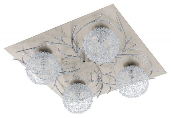 Люстра Eglo 91345 Hedda – прекрасный осветительный прибор для внутреннего использования, изготовленный компанией Eglo (Австрия). Гарантийный срок составляет 1 год. Модель можно найти в каталоге Eglo Interior Lighting 2012-2013 в разделе Wall & Ceiling Luminaires на странице 402. Светильники серии Hedda станут отличным дизайнерским акцентом в интерьере.Светильник Eglo 91345 Hedda с флористическими узорами станет украшением любого помещения. Ведь мотивы, навеянные самой Матушкой-природой, могут смягчить выдержанность строгой классики, дополнить очарование модерна или стать завершающим элементом декора в кантри-помещении.Люстра Eglo 91345 Hedda – осветительный прибор, в основании которого используется металл, в плафоне – стекло, алюминий. Цвет основания матовый никель отлично гармонирует с оттенком прозрачный, в котором выполнен плафон.Люстра Eglo 91345 Hedda имеет такие габариты: высота – 12,5см, длина – 39см, ширина – 39см.Мощность основной лампы составляет 40Вт, цоколь типа G9.Люстра комплектуется галогенной лампой. Она имеет компактные размеры и очень хорошую цветопередачу, немного подчеркивающую теплые тона.Количество источников света в модели Eglo 91345 Hedda – 4шт.Люстра подключается от сети 220в.Светильник Eglo 91345 Hedda обладает степенью пылевлагозащиты IP20, которая обеспечивает защиту поверхности осветительного прибора от сознательного контакта с пальцами и предметами с подобными параметрами.EAN 9002759913458.